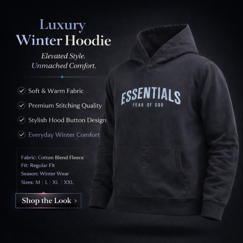 প্রিমিয়াম কটন-ব্লেন্ড ফ্যাব্রিকে নিখুঁতভাবে তৈরি এই হুডিটি স্পর্শেই আলাদা অনুভূতি দেয়। গভীর রঙের পরিশীলিত টোন, মিনিমাল ESSENTIALS Fear of God ব্র্যান্ডিং এবং ক্লিন সিলুয়েট—সবকিছু মিলিয়ে এটি একটি এলিট উইন্টার স্টেটমেন্ট।